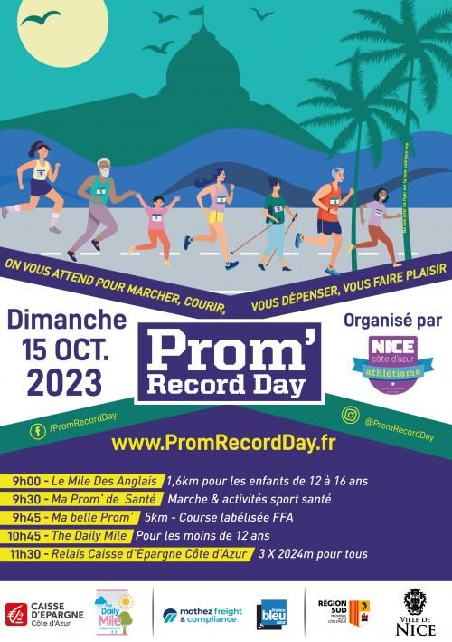 Le Prom' Record Day est un événement d’athlé « naturel » dans un environnement urbain (Marcher, courir…), accessible à tous les publics (Enfants, adultes, seniors, familles, entreprises…), sur le site exceptionnel de la promenade des Anglais. Organisé par le Nice Côte d’Azur Athlétisme, 1er club de la région Sud PACA