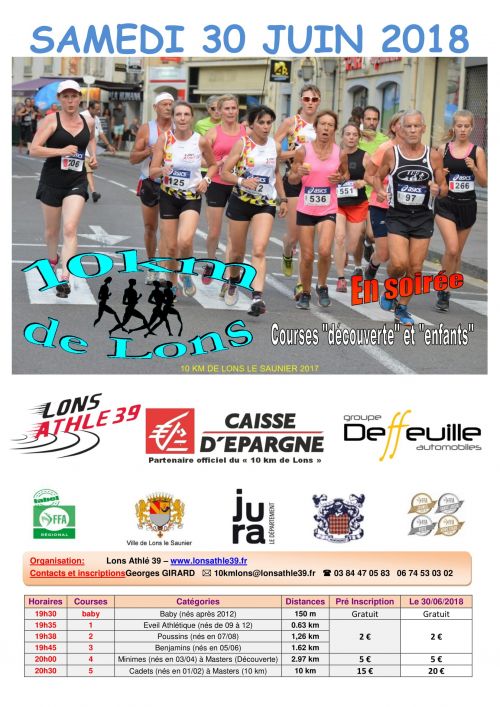 Chaque année, le Lons Athlé 39 organise un 10km route FFA à la fin du mois de Juin. L'épreuve se déroule dans les rues de la cité jurassienne de Lons-le-Saunier. Le départ étant placé en début de soirée, il s'agit d'une excellente opportunité pour tous les coureurs qui veulent se tester et battre leurs records personnels. En effet, le parcours est composé de deux boucles relativement plates et très roulantes.