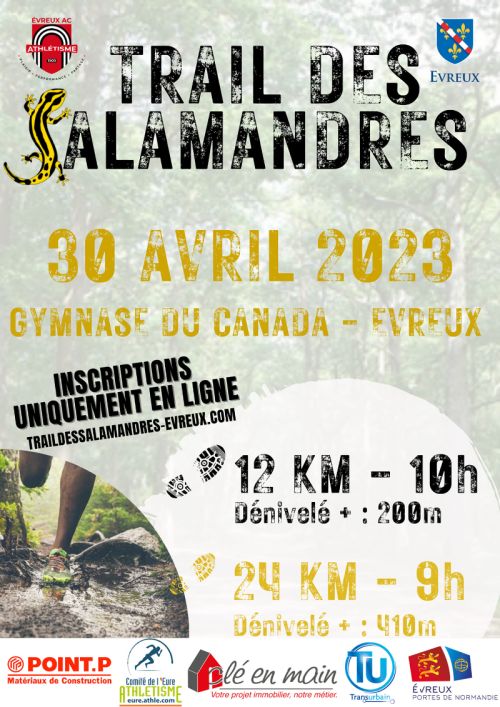 Evreux AC Athlétisme organise son Trail des Salamandres. 12km ou 24km rendez vous au gymnase du Canada à Evreux .