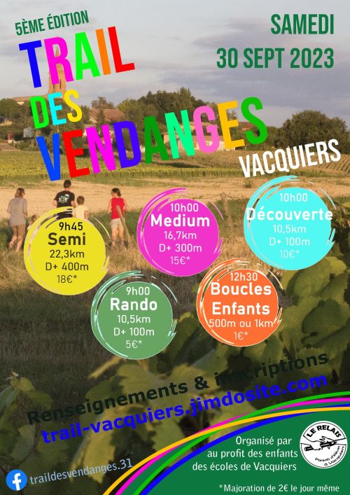 Le Trail de Vacquiers organisé par l'association des parents d'élèves est confirmée avec un tout nouveau parcours pour les plus aguerris. Le Trail des Vendanges empruntera à 90% les chemins de la commune de Vacquiers entre vignes et forêt.