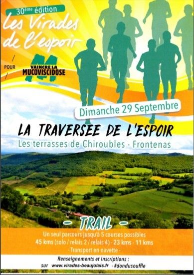 L’association Vaincre la Mucoviscidose, organise dans le cadre de l’événement annuel des Virades de l’Espoir,, la 1ere édition du trail des Virades du Beaujolais, course à pied nature comportant un seul parcours (43,50 kms) avec différentes sections comprenant des relais et 3 départs possibles.