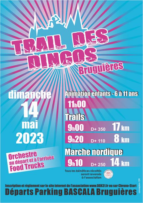 Le Trail des Dingos est de retour - Encore plus convivial ! Les DDX seront heureux de vous accueillir pour le Trail des Dingos au profit de l'association "Petit Coeur de Beurre". Vous traverserez les bois de Bruguières et passerez par le mythique terrain du motocross pour un parcours ludique. A l'arrivée, nous vous réservons une super ambiance avec bandas et repas tapas !