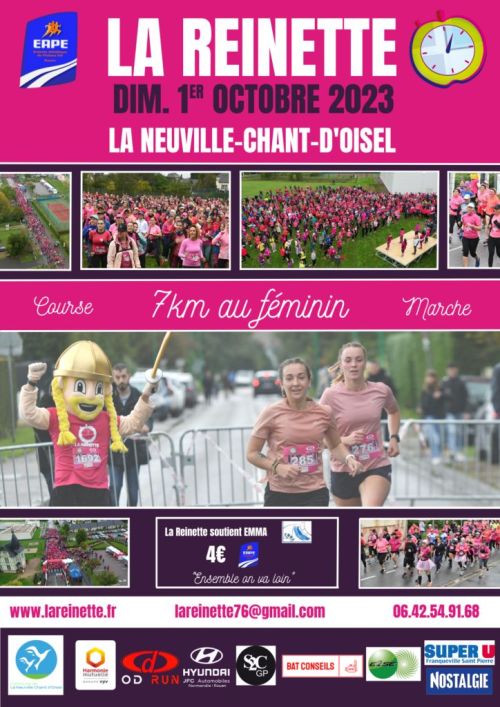 La Reinette revient pour sa 14ème édition à Belbeuf (76). Une course exclusivement féminine en partenariat avec l’association Emma qui lutte contre le cancer du sein. Départ à 10h pour 7km avec au choix : une course, une marche, et une marche nordique sur un parcours accessible à toutes. Attention les dossards sont limités à 2000 participantes.