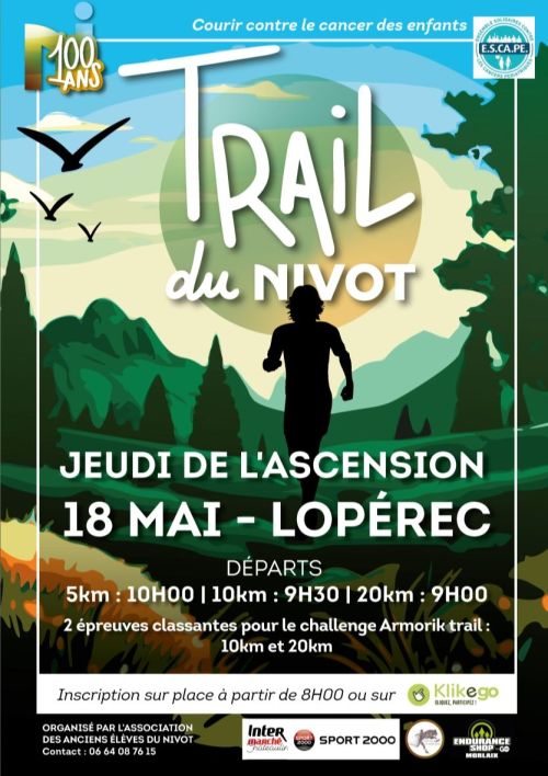Venez plonger au coeur des monts d'arrées dans le prestigieux domaine du NIVOT et ses alentours avec nos 3 circuits de 5,10 et 20 km. Ravitaillement sur le 10km et 20km L'argent récolté lors du Trail sera reversé à l'association ESCAPE de Pont-De-Buis. Cette association récolte des fonds afin de financer la recherche sur le cancer des enfants, soutenir les familles des enfants malades moralement et financièrement et communiquer auprès du grand public sur les cancers pédiatriques.