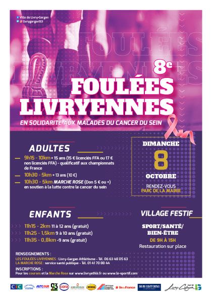 Foulées Livryennes 10 km pour les athlètes de 15 ans et plus (une partie reversés à Octobre Rose) – qualificatif pour les championnats de France