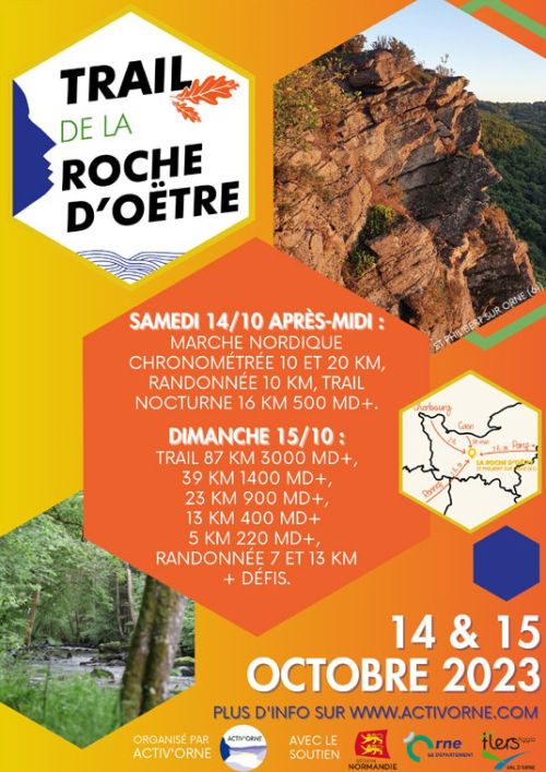 Trail de la Roche d'Oëtre avec 5 parcours dont 1 ultra trail et un trail nocturne. Deux défis possibles et courses en solo ou relais.