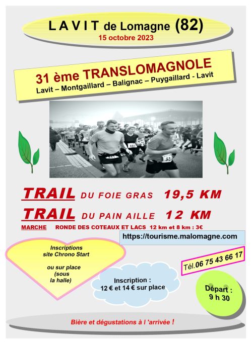 La Translomagnole avec deux trails au départ et retour de la Halle de Lavit. Trail du foie gras et trail du pain aillé, et marches : ronde des coteaux et lacs 12 et 8 km.