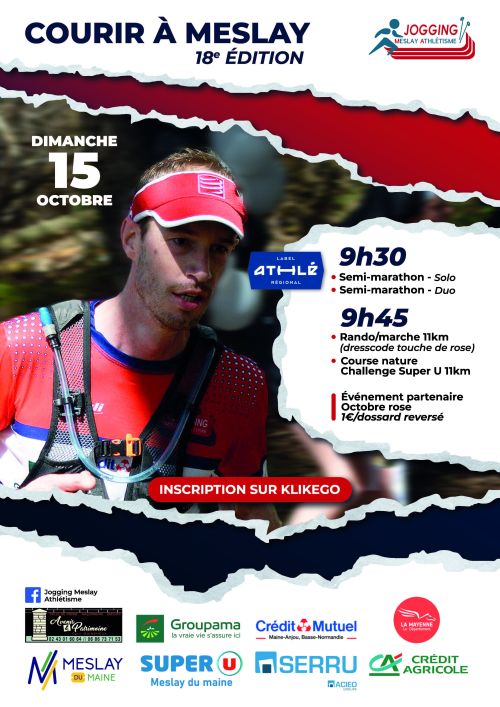 Semi-marathon de Meslay du Maine : 14ème édition, labelisé et qualificatif au championnat de France. Circuit en 3 boucles distinctes (1,500 km + 7,500 km + 12,100 km) vers les villages de St Denis du Maine et Arquenay, le tour de la base nautique de la Chesnaie et le sentier pièton en sable dur pour revenir à Meslay du Maine. Pas de difficultés majeures, faux-plat de 600m avant le 16ème km. Nouveautés possibilités de courir en DUO le semi-marathon : 9km pour le premier relayeur et 12.1km pour le second.