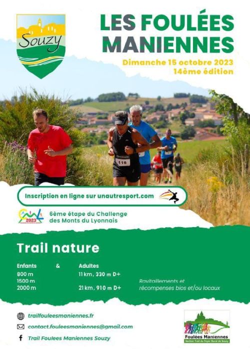 Le Trail des Foulées Maniennes est organisé par la section "Les Foulées Maniennes", section sportive placée sous la tutelle de l'association "Le Foyer Rural de Souzy". Trois courses enfants sont organisées (800 m, 1500 m et 2000 m), elles ne sont pas chronométrées. Lieu de l’épreuve : Souzy, départ et arrivée salle polyvalente. Parcours sur des chemins : 80% pour les adultes, 100% pour les enfants. Course ouverte aux femmes et aux hommes, licenciés (FFA/FFTRI) et aux non licenciés.