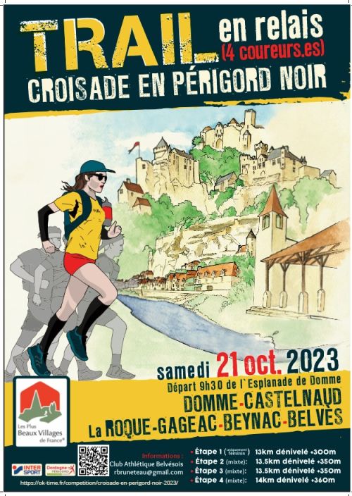 Cette course trail en relais de 4 coureurs dont au moins 1 féminine partira du village de Domme pour rejoindre celui de Belvès en passant par Castelnaud la Chapelle, La Roque, Gageac, Beynac soit les 5 plus beaux villages de France classés en Périgord Noir.