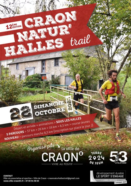 Craonnatur'halles trail avec 5 courses au programme ( 37km, 26km, 16 km, 8.5km et course jeunes). Ce trail permet d'allier une épreuve sportive à une découverte du patrimoine craonnais L'an dernier, notre manifestation a été labellisée de la médaille de bronze dans le cadre du projet "Développement durable, le sport s'engage" organisé par le Comité National Olympique et Sportif Français. Nous chercherons à être encore plus proche de nos coureurs et de notre objectif d'un trail vert, puis que nous repostulons sur ce label.