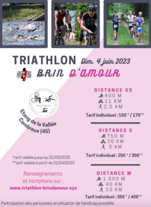 Triathlon de Brin d'Amour à Combreux (45 - Loiret). La natation se déroule sur l'Etang de la Vallée. Le parcours vélo traverse les villes de Combreux, Vitry-aux-Loges, Sury-aux-Bois, Nesploy, Seichebrières. La course à pied s'effectue dans la forêt de Combreux.