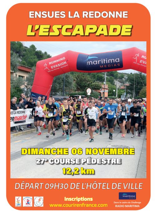 La course de l'Escapade (12,2 km) organisée par l'Escapade du Pied en collaboration avec la Municipalité. Comme l’an dernier, le départ et l’arrivée se feront depuis le parvis de l’Hôtel de Ville à 9h30. Course essentiellement dans la colline (pistes forestières). Panorama splendide sur la baie de Marseille !