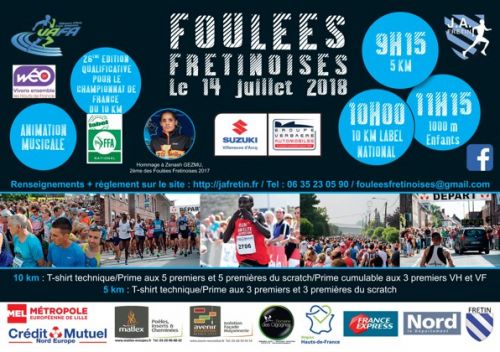 26ème édition des Foulées Fretinoises. Le parcours des foulées Fretinoises est bien connu pour être l'un des plus plats de l'hexagone. C'est l'occasion rêvée pour améliorer son chrono sur la distance. Cette année, 6 meneurs d'allure seront là pour vous emmener dans les meilleures conditions du départ à la ligne d'arrivée dans les temps ! Fondée en 1993, cette course au label national est qualificative aux Championnats de France du 10 Km. Cette compétition est classée dans le top 15 des courses de la région.