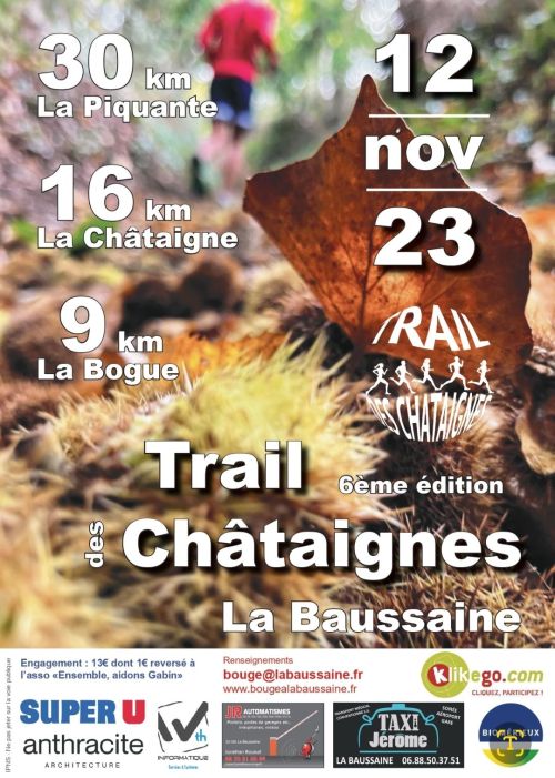 L’association «Bouge à La Baussaine» propose une 3ème édition du «Trail des Châtaignes » au départ de La Baussaine. Les tracés des 2 courses ont été légèrement modifiés par rapport à l'édition précédente. 1€ par inscription sera reversé à l'association "Ensemble, aidons Gabin" !