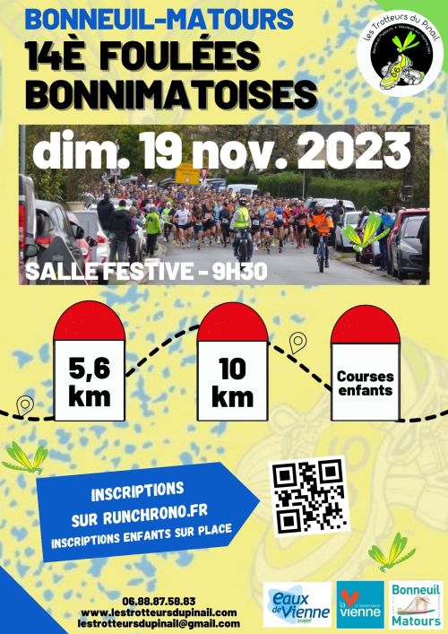 Les Foulées Bonnimatoises sont des courses de 5,6 km et 10 km sur terrain plat autour de Bonneuil-Matours principalement sur route. Une boucle pour le 5,6 km et deux boucles pour le 10 km (circuit mesuré officiellement).