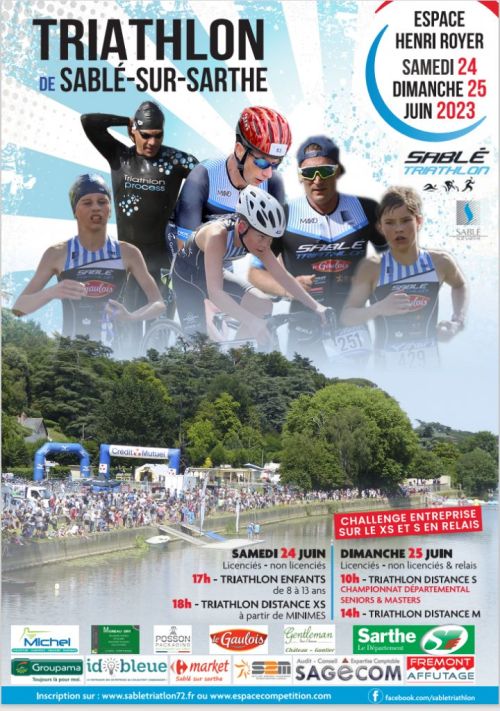 Triathlon de Sablé sur Sarthe organisé par le SABLE Triathlon sur le site de l’Espace Henri Royer, rue Michel Vielle. 5 courses Triathlon sont au programme.