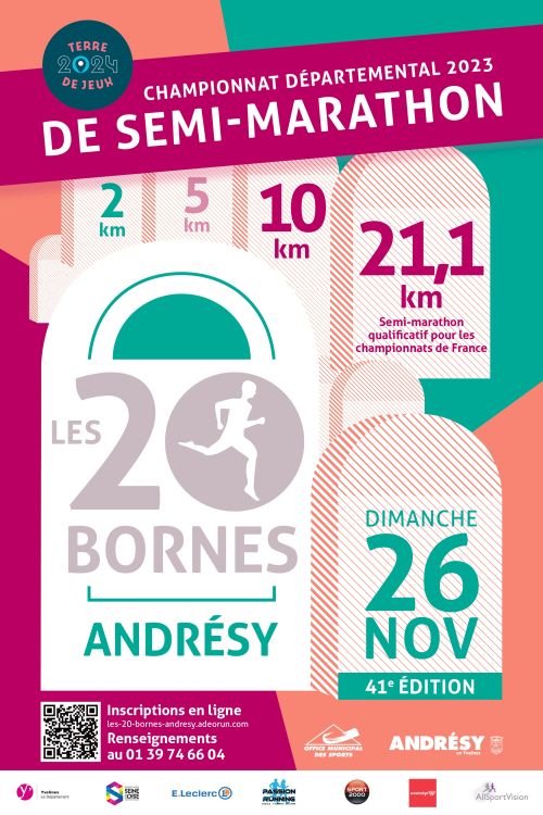 Chaque année depuis 1982 (le dernier dimanche de novembre), plus de 2 000 coureurs se lancent à la conquête des « 20 BORNES » d’Andrésy. Cette épreuve de haut niveau, labellisée et inscrite au calendrier des courses Hors stade de la Fédération Française d’athlétisme, propose des parcours de qualité aux sportifs de haut niveau, aux initiés et non initiés, aux jeunes et moins jeunes, aux handisports… Le semi-marathon est une course qualificative pour les championnats de France.