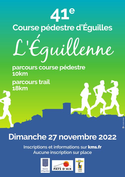 Course pédestre d'Eguilles avec 2 parcours au programme : -un 10km sur route essentiellement autour du village avec une arrivée splendide sur le parvis de la mairie, après deux derniers kilomètres difficiles -un trail de 18km à 80% sur chemins et sentiers, dans la forêt d'Eguilles offrant des vues magnifiques sur le village et ses environs Entre 500 et 600 coureurs environ chaque année.