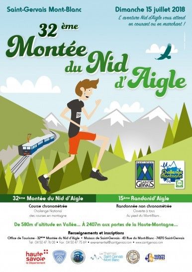 Au pied du Mont-Blanc … De 580m d’altitude en vallée …A 2407m aux portes de la Haute-Montagne … L’aventure du Nid d’Aigle vous attend, en courant ou en marchant ! La 32ème montée du Nid d’Aigle, ouverte uniquement aux majeurs est une course chronométrée comptant pour le Challenge National des Courses de Montagnes. L’utilisation des bâtons et chaussures à pointes est interdite pour la course sous peine de disqualification.
