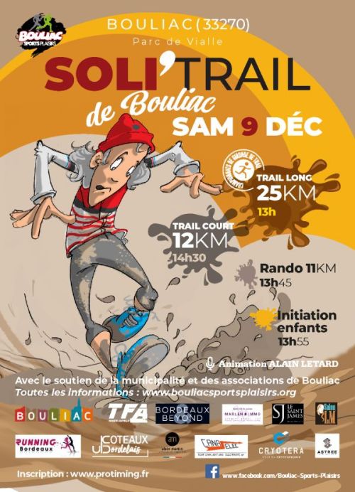 Comme chaque année début décembre, nous vous attendons à Bouliac pour courir et marcher sur des chemins souvent humides voire un peu gras, mais toujours avec le sourire car vous courez pour des associations à qui nous reversons les bénéfices de la manifestion.