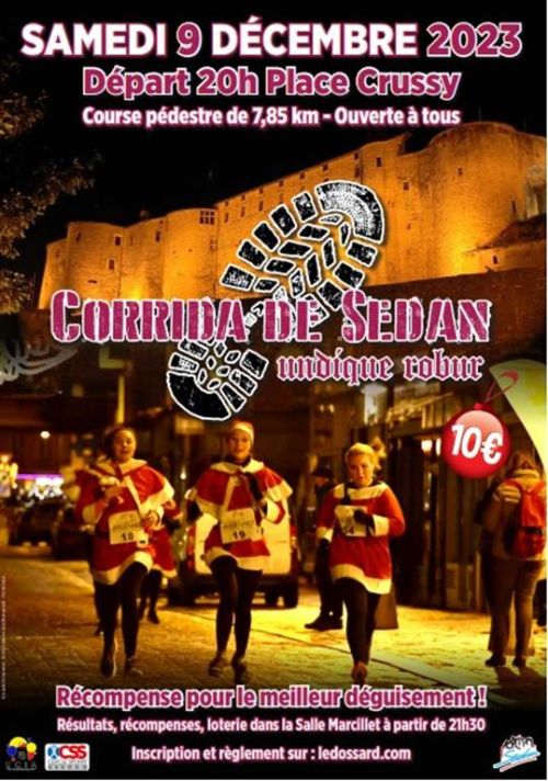 Coorganisée par l'UCIA , le Club Athlétique Sedanais et l'AS Sommer, la Corrida de Sedan terminera une journée du marché de Noel de la ville . Départ donné à 20h00 sur la place Crussy, le parcours se déroulera sur 3 boucles dans les rues du centre ville avec autant de passages dans la cour du plus grand château fort d'Europe.