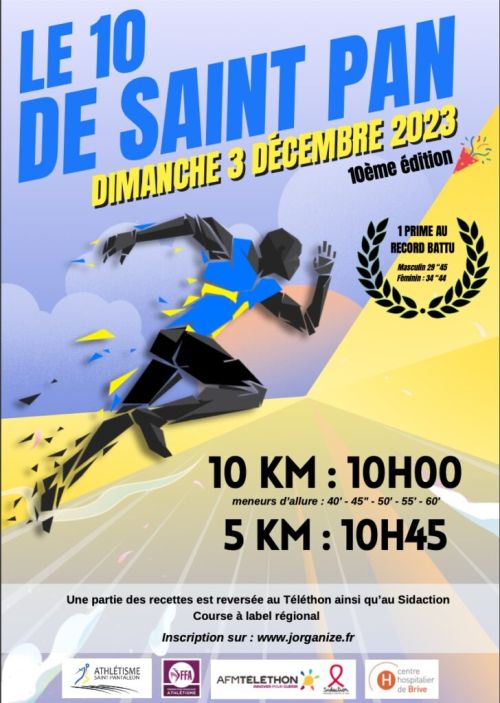 Le 10 de Saint Pan est qualificatif pour les championnats de France des 10 kms. La course se déroulera sur le même parcours que les éditions précédentes plat et sans difficulté. Elle est ouverte à tous quelque soit votre niveau de pratique Le départ se fera un peu avant le pont qui enjambe la Vézère à l'entrée de Saint-Pantaléon et l'arrivée près de l'espace vézère Causse au centre du bourg.