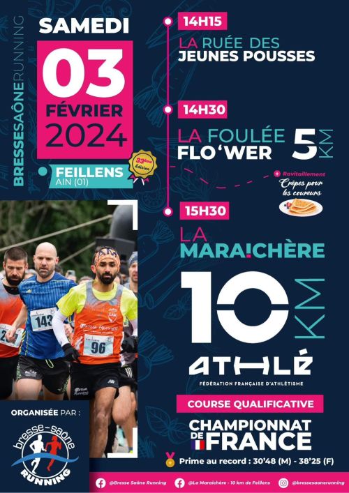 Le Bresse Saône Running vous attend nombreux à Feillens pour participer à la course « la maraichère » avec 3 formats de courses différents. Un nouveau parcours sur la course historique de 10km labellisée FFA avec deux boucles de 5km pour gagner en rapidité et en convivialité (zone supporter 100% piétonne). Les enfants pourront aussi faire chauffer les baskets et participer à la course qui leur est réservée « la ruée des jeunes pousses ».