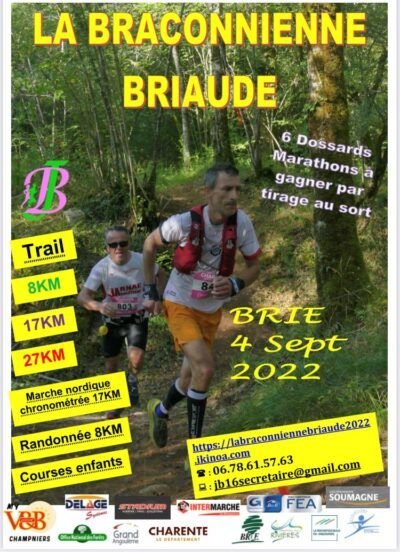 La Braconnienne Briaude. Comme l'an passé, lieu de départ/arrivée depuis La Vallée de Brie, au pied du bourg de la commune de BRIE. Cherchez l'Eglise et vous êtes presque arrivés. Cette année, nous changeons les parcours ET les distances. Nous vous proposons toujours le 8km qui serpente aux alentours de notre village. Nos autres tracés, 17km (solo, duo et marche nordique), 23km et 32km quand à eux rejoignent la forêt de la Braconne 95% de chemins et monotraces.