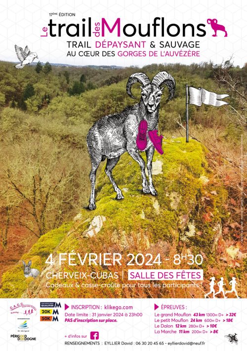 Trail des Mouflons, organisée par le Cacc running. Ce trail de 42km dans les gorges de l'Auvézere permet de découvrir des paysages inédits du Périgord. Le 23 km est non moins impréssionant avec l'ascension du Rocher du Diable. Un 11 km rend accéssible à tous ce trail exceptionnel en Dordogne. Une marche de 11 km et un casse croute pour tous les participants, permettent à tous de passer un trés bon moment ... Alors n'hesitez plus , inscrivez vous pour vivre l'experience unique du Trail des Mouflons...