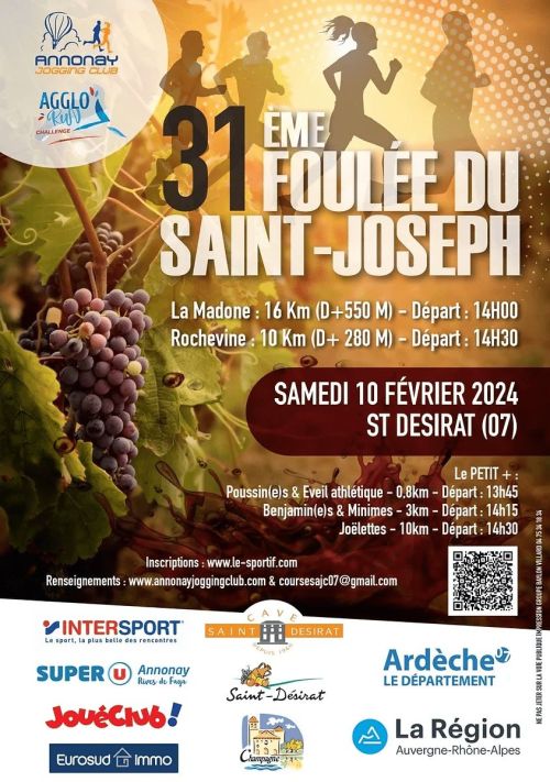 Départ de la Maison des Vins à 15h15 pour 10 km à travers le domaine Rochevine et les alentours du village de St Désirat. Montée de 150 m en escaliers à mi-parcours. Pour cette édition un parcours de 17km sera proposé sans oublier les courses enfants