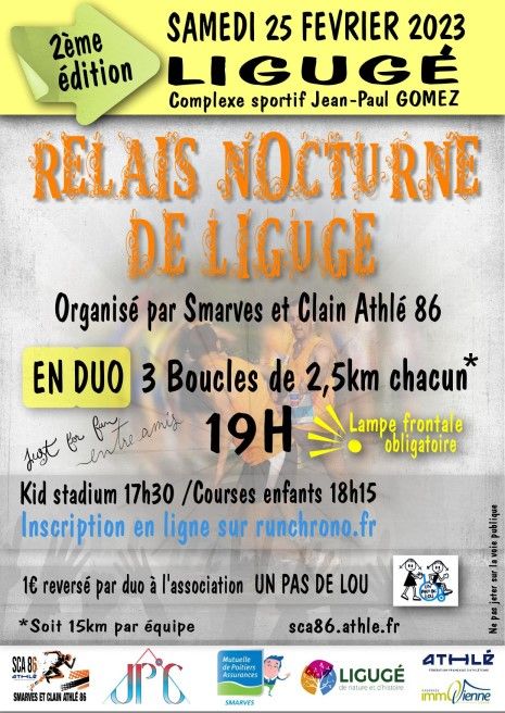 Le club Smarves et Clain Athle 86 organise le Relais Nocturne de Ligugé, une course pédestre en relais par équipe de deux coureurs où Chaque coureur effectuera trois tours de 2,5 km, soit une distance de 7,5 km.