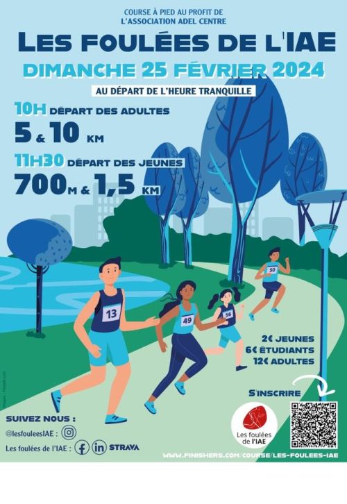 Les Foulées de l'IAE propose deux courses sportives de 5 et 10 kilomètres destinée à un public varié : étudiants, amateurs, initiés et entreprises. La course se déroule au Quartier des Deux Lions de Tours, à proximité de l’IAE et emprunte un parcours tracé autour du lac de la Bergeonnerie. Nous soutenons l’association tourangelle ADEL Centre, se trouvant à l’hôpital Clocheville. Son but est de venir en aide aux enfants atteints de leucémie en leur permettant de réaliser leurs rêves, en aidant leurs familles et en achetant du matériel. Les bénéfices réalisés grâce à la participation des coureurs et au soutien de nos sponsors nous permettent de faire un don à l’association chaque année.