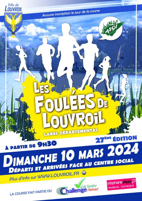 Les Foulées de LOUVROIL se déroulent tous les ans le 2ème Dimanche de Mars, organisées par l’Amicale Sportive et Gymnique de LOUVROIL avec le support de l’USM Athlétisme affilié à la Fédération Française d’Athlétisme, ainsi que de nombreux bénévoles. Le retrait des dossards se fera au Restaurant du Lac le jour de la course à partir de 8h30.