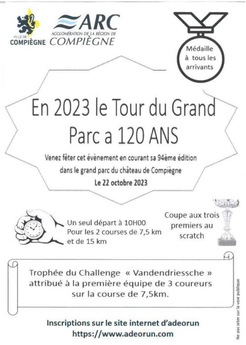 Plus vieille epreuve française se deroulant autour du Grand Parc du château de Compiegne. Course créée en 1903 (120ème année). Cette course se déroule sur route. Challenge Vandendriessche. Médaille a tous les arrivants.