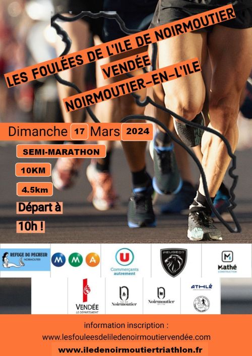 Les Foulées de l'Ile de Noirmoutier Vendée se dérouleront sur la commune de "Noirmoutier-en-l'Ile". Cette manifestations sportive 1ere édition, proposera 3 formats de course. Le semi-marathon étant situé sur le calendrier un mois avant le marathon de Nantes, il rentre parfaitement dans la préparation de ce dernier. Les amateurs comme les professionnels de la course à pied n ont plus qu'à courir sur le 4.5km, le 10km ou le 21.095km . Ces formats sont donc accessibles au grand public, alors n hésitez plus, inscrivez vous et venez découvrir l'ile de Noirmoutier, ses marais, plages, forêt domaniale, son châteaux, ses ports...