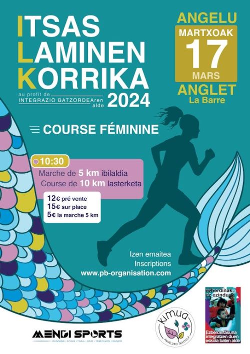 Nouvelle édition d' Itsas Laminen Korrika, course organisée par l'ikastola Kimua d'Anglet pendant les fêtes d'Anglet. Les bénéfices de la course seront reversés à Integrazio Batzordea qui finance la scolarisation des enfants handicapés au sein des ikastola en salariant des éducateurs (trices) spécialisés ainsi que les AVS non pris en charge.