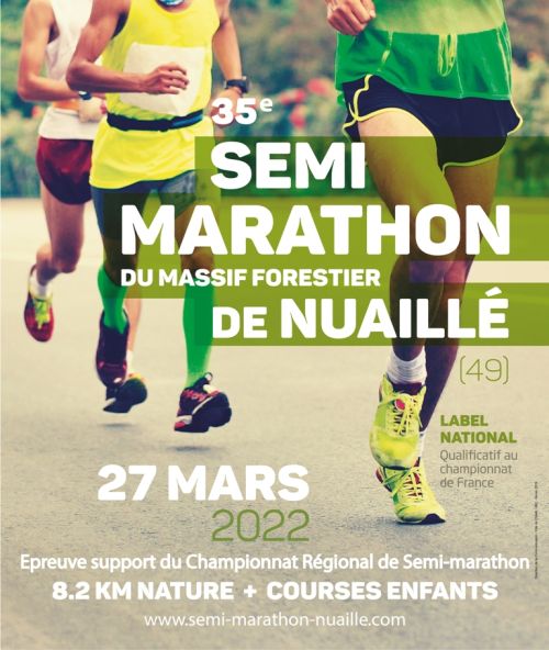34ème Edition. Départ et Arrivée à NUAILLE. Une seule boucle avec les 3/4 du parcours en forêt, il est un des Semi-marathons les plus agréable de la région des Pays de Loire.