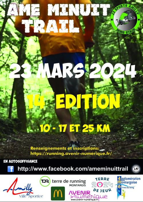 L’AME MINUI TRAIL est une épreuve nocturne de course à pied de 25 kms - 15 kms et 10 kms en autosuffisance, organisée par la section d’Athlétisme des J3 Sports Amilly. Le départ sera donné à 19h30. Aux environs 8 ème kilomètre de la course les participants choisiront la distance qu’ils souhaitent réaliser en s’engageant alors sur le petit parcours (15km) ou sur le long (25km). Un pointage obligatoire sera réalisé à ce moment de la course.