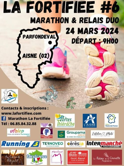 Le marathon, marathon duo La Fortifiée est le seul du département de l'Aisne. Le départ et l'arrivée se font de Parfondeval labélisé "plus beau village de France". Marathon champêtre au coeur des paysages de Thiérache. Traversant 15 villages, La Fortifiée promet grand air, beaux paysages et la découverte de nos églises fortifiées. Marathon individuel ou Marathon Duo (1er=22km 2éme=20km). Relais à Vigneux Hocquet. Parcours verdoyant avec de légers faux plats sur la 1ére partie. La 2ème partie est un peu plus vallonnée avec une côte sur le final.