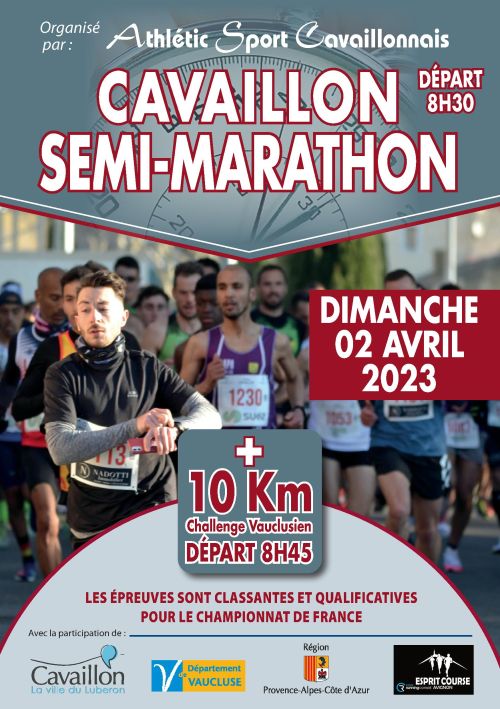 Semi-Marathon de Cavaillon avec épreuves classantes et qualificatives pour les Championnats de France Individuel et par Equipe. Les dossards pourront être retirés, soit le Samedi de 16H à 18H, soit le Dimanche matin à partir de 7H à la Mairie de Cavaillon.