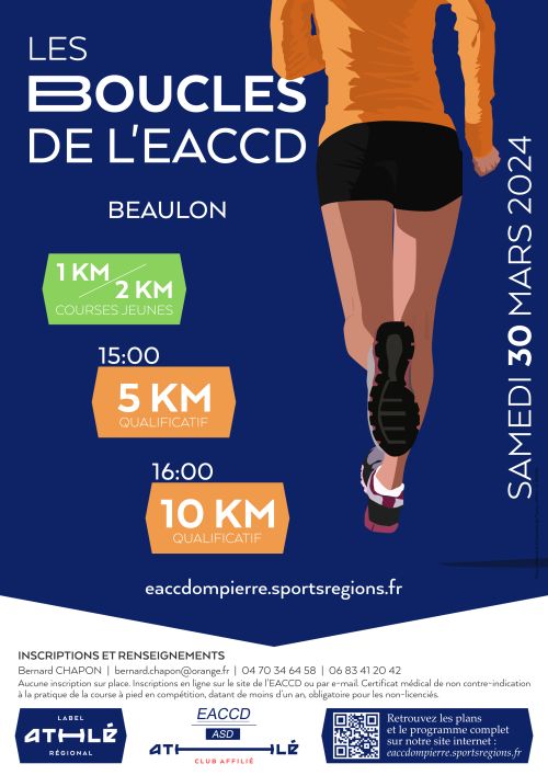 Les Boucles de l'EACCD : 5 km et 10 km qualificatifs pour les championnats de France. 4 courses sont au programme : 5 km (nés en 2010 et avant) – départ à 15h00 – 10 € pour les licenciés FFA (12 € pour les non-licenciés) 10 km (nés en 2008 et avant) – départ à 16h00 – 12 € pour les licenciés FFA (14 € pour les non-licenciés) 1 km (Poussins, nés en 2013 et 2014) – départ à 14h15 - gratuit 2 km (BE et MI, nés en 2009, 2010, 2011 et 2012) – départ à 14h30 – gratuit Remboursement intégral en cas d’annulation.