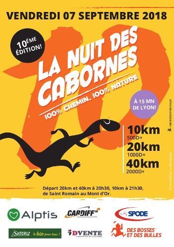 L’association sportive Saône Mont d’Or Nature organise la 10 ème édition de la Nuit des Cabornes, un trail nocturne comportant 3 épreuves. La course se déroule sur des chemins et quelques traversées de routes communales, sur un circuit relativement technique. Le dénivelé positif est de 2000 mètres pour le 40 km et 1000 m pour le 20 km et de 500 mètres pour le 10 km.