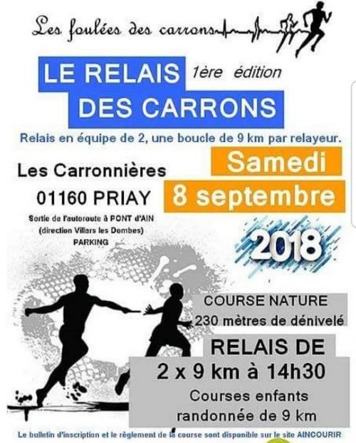 Course de 18 kms par équipe de 2. chaque coureur parcours 9 kms. (2 boucles identiques de 9 kms, le relais s'effectuera sur la ligne de départ et 2 coureurs finiront les 500 dernier mètres ensemble). Parcours variés et nature sur les hauteurs de Priay.