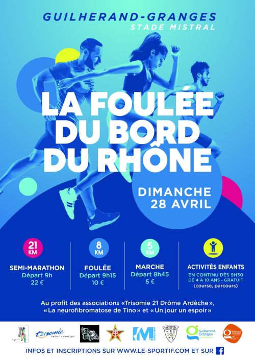 Trois différentes courses vous sont proposées cet année : • Un semi-marathon inscrit aux listes départementales partant du Stade Mistral, longeant la berge du Rhône jusqu'au village de Chateaubourg avant de revenir en direction de l'arrivée au Stade Mistral. • Une course 8km partant du Stade Mistral avant de faire une boucle. • Une randonnée
