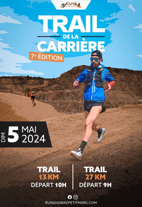 Le Trail de la Carrière avec 3 épreuves au programme. Une course nature de 13km, un trail de 27km et une marche nordique de 16km. Les circuits emprunteront un maximum de chemins (~95%). Les coureurs découvriront la surprenante Carrière CHASSÉ, la campagne de Petit-Mars avec ses marais mais auront également une occasion unique de traverser les allées des Pépinières du Val d’Erdre (pour l’épreuve trail uniquement).