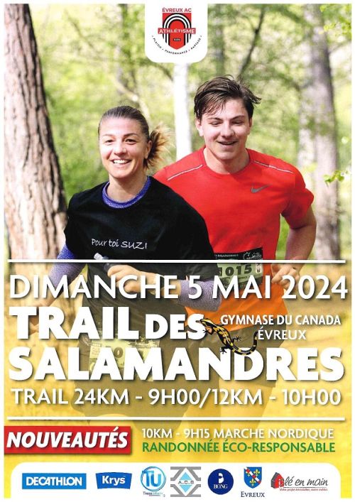 Evreux AC Athlétisme organise son Trail des Salamandres. 12km ou 24km rendez vous au gymnase du Canada à Evreux.