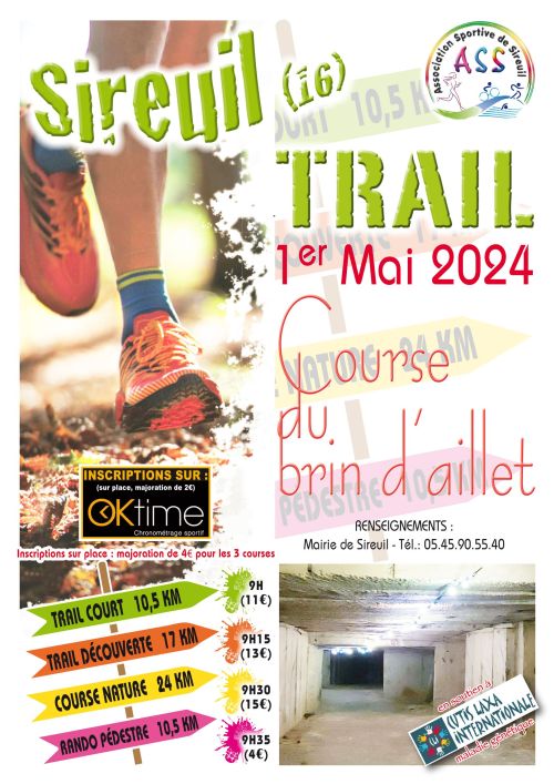 L’association sportive de SIREUIL vous propose de venir découvrir un nouveau circuit TRAIL Court de 24 kms qui s’ajoute aux distances existantes de 16 kms et 8 kms. Chaque course est constituée d'une seule boucle. Trois circuits atypiques qui vous feront traverser le vignoble, les carrières souterraines et admirer ses panoramas sur le fleuve Charente.