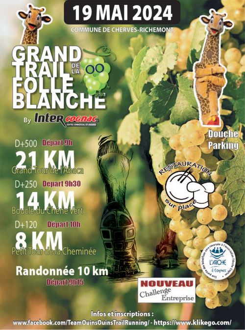 Le Grand Trail de la Folle Blanche est une course à pied hors stade de type Trail qui se déroule quasiment à 100 % sur chemin. Cette épreuve d’endurance qui conjugue aspect convivial, beauté des paysages et caractère sportif, nécessite un entraînement adéquat aux distances et dénivelés proposés. Le site de Cherves-Richemont, situé au coeur du vignoble Cognaçais est un cadre idéal pour le déroulement d’un événement de ce type.