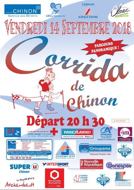C'est dans un site exceptionnel au bord de la Vienne, dominé par la forteresse de Chinon que se déroulera la 15ème édition de la Corrida de Chinon. Plus festive et accessible à tous, la Corrida se déroulera sur un parcours avec vue sur le chateau en empruntant les 2 rives de la Vienne. Le parcours sera agrémenté d' animations diverses et se terminera devant l' espace Rabelais pour la remise des récompenses. Convivialité, sport et bonne humeur seront au Rendez-vous .